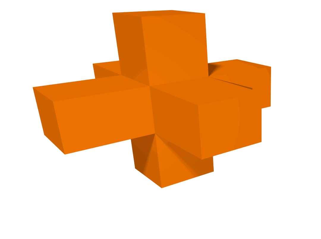 This produces a series of rectangular boxes that span the area that is going to be removed, for a given dimension. To produce the void cubes for the level-1 sponge, we simply call voidCubes(0). Making a union of several dimensions produces the void cube structure for the higher level menger sponges, such as: